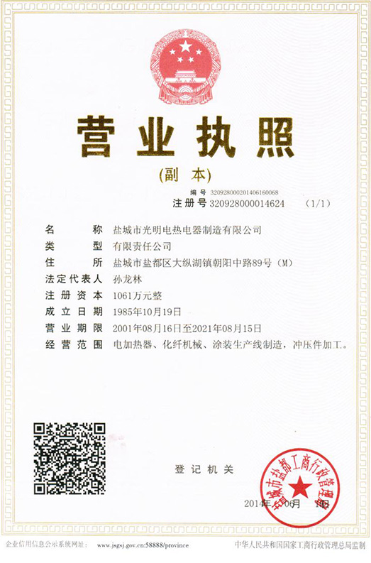 鹽城市光明電熱電器制造有限公司目前主要生產各種電加熱器系列、轉動車、升降臺系列、涂裝生產線等